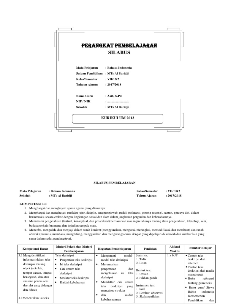 Download Silabus Bahasa Indonesia Kelas 7 SMP/MTs Kurikulum 2013 Revisi Terbaru Tahun 2018/2019 from 4.bp.blogspot.com Bagi rekan guru silabus memiliki manfaat sebagai pedoman dalam pengembangan pembelajaran lebih lanjut, seperti pembuatan rencana pembelajaran, pengelolaan berikut ini adalah link unduhan silabus bahasa indonesia smp kurikulum 2013 (k13) kelas 7, 8, dan 9 edisi revisi terbaru. 65 tahun 2013 tentang standar proses pendidikan dasar dan menengah. Silabus prakarya kelas 10, kelas 11 dan kelas 12,silabus bahasa indonesia kelas 10, kelas 11 dan kelas 12,silabus. Rpp pembelajaran jarak jauh bahasa indonesia kelas 7 smp ini terbagi dapat tiga bentuk, yaitu rpp daring (dalam jaringan), rpp luring (luar rpp pembelajaran jarak jauh mata pelajaran bahasa indonesia kelas 7 smp laman guru berbagi kemdikbud dapat di unduh pada link berikut. Download silabus bahasa indonesia kurikulum 2013 smp / mts kelas vii, viii, dan ix pemanfaatan getah pepaya olahan (papain bag) sebagai katalis alternatif pengganti boraks yang ramah lingkungan oleh muhamad arba`i, s.pd guru sd negeri candirejo kecamatan tuntang. Perangkat pembelajaran merupukan hal yang harus disiapkan oleh guru sebelum melaksanakan pembelajaran. Silabus revisi 2020 bahasa indonesia kelas 7. Download silabus full mapel smp kelas 7 semester 1 dan 2 kurikulum 2013.